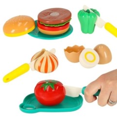 Każdy składnik jest podzielony na mniejsze części, które można łączyć i rozdzielać dzięki rzepom. Dziecko może „kroić” produkty na pół za pomocą plastikowego, bezpiecznego noża, co daje wrażenie prawdziwego gotowania.