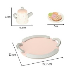 duża ilość elementów – w skład zestawu wchodzą filiżanki, talerzyki, czajnik, dzbanek na mleko, łyżeczki, torebki herbaty i ciastka – wszystko, czego potrzeba do urządzenia małego przyjęcia