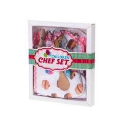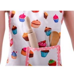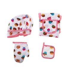 W zestawie znajdują się akcesoria – fartuch, rękawica kuchenna, czapka i podkładka pod gorące naczynia – w kolorowe babeczki, które zdecydowanie mogą narobić apetytu. A sama czapka pozwoli poczuć się jak prawdziwy szef kuchni.