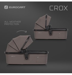 Wózek dziecięcy CROX marki EURO-CART to produkt skrojony na miarę potrzeb. Można go kupić jako sam wózek spacerowy z przepinanym siedziskiem (możliwość montażu zarówno przodem jak i tyłem do kierunku jazdy) lub dokupić dużą wygodną gondolę, tworząc w ten sposób zestaw 2 w 1.