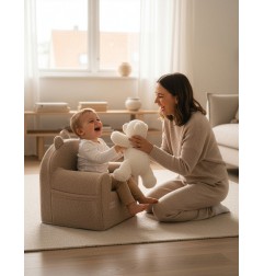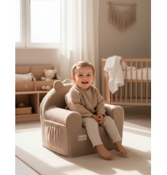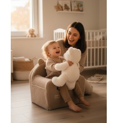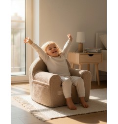Ten uroczy, lekki fotelik został zaprojektowany z myślą o małych użytkownikach, którzy zaczynają samodzielnie siedzieć. Jest idealny do zabawy, czytania książeczek oraz wygodnego odpoczynku. Pokryty jest w całości modną, puszystą tkaniną typu Boucle popularnie zwanej "barankiem", która wprowadza do każdego wnętrza ciepło i przytulny klimat.