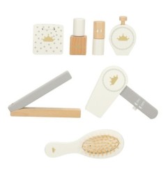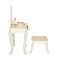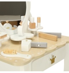 Toaletka wraz z akcesoriami jest wykonana w całości z drewna, którego zostało wyszlifowane na gładko i pomalowane nietoksycznymi farbami. Biało-złota kolorystyka sprawia, że zestaw jest minimalistyczny i doskonale sprawi się jako ozdoba pokoju dziecka.