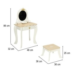 Toaletka posiada wszystkie udogodnienia prawdziwego mebelka – duże, okrągłe lusterko oraz półki i szufladę na kosmetyczne akcesoria. Oraz praktyczny taboret, który ułatwi wykonywanie „makijaży” w wygodnej pozycji.