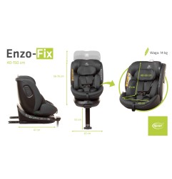 Fotelik 4BABY ENZO-FIX należy do nowej generacji fotelików samochodowych, które spełniają wymagania najbardziej restrykcyjnej normy bezpieczeństwa homologacji R129 / I-size. Gwarantuje to najwyższą ochronę dziecku o wzroście od 40 do 150 cm. Enzo-fix jest zintegrowany z obrotową bazą wyposażoną w system Isofix oraz nogę stabilizacyjną wraz z sygnalizatorami poprawnego montażu.Funkcja obrotu o 360°, umożliwia łatwą zmianę kierunku jazdy montażu, a także komfortowe zapinanie malca do w foteliku, jak i wyjmowanie go z samochodu.Fotelik Enzo-fix jest montowany tyłem do kierunki jazdy (RWF) aż do wzrostu 105 cm małego pasażera (czyli około 4 lat), a bezpieczną i komfortową podróż zapewni mu 5-stopniowa regulacja siedziska w zakresie 132-145°. Natomiast podróż przodem do kierunku jazdy jest możliwa od 76 do 150 cm w 5-stopniowej regulacji o zakresie od 108° do 121°. Modułowa budowa fotelika umożliwia dopasowanie do dziecka na każdym etapie rozwoju. Noworodki i niemowlęta korzystają ze specjalnej wkładki redukcyjnej, która wypełnia fotelik i wypłaszcza pozycję dziecka, gwarantując mu poprawne fizjoloficznie ułożenie ciała. 5-punktowe pasy bezpieczeństwa w foteliku posiadają nakładki naramienne oraz nakładkę na pas krokowy, dbające, by mocno zaciągnięte pasy nie psuły dobrego samopoczucia dziecka. Dla wygody nieco większych dzieci fotelik wyposażony jest w 15-punktową regulację zagłówka, co pozwala na optymalne dopasowanie go do wzrostu dziecka.Specjalne panele boczne w foteliku dbają o to, aby w trakcie zderzenia bocznego jeszcze lepiej chronić dziecko przed konsekwencjami uderzenia. Panele absorbują energię uderzenia, przez co nie są one skierowane na małego pasażera.