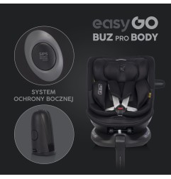 EASYGO BUZ PRO BODY można również zakupić jako niezależny fotelik samochodowy I-SIZE dla dzieci od 40 do 150 cm. Niezbędne jest jednak dokupienie samochodowej obrotowej bazy ISOFIX marki EASYGO, ponieważ BUZ PRO BODY można instalować wyłącznie w połączeniu z tą bazą.
