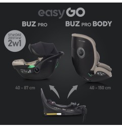 STWÓRZ ZESTAW 2 W 1 – BUZ PRO BODY jest elementem zestawu 2 w 1 z fotelikiem EASYGO BUZ PRO, więc montowany jest na tej samej samochodowej bazie ISOFIX. Jest to rozwiązanie tańsze niż zakup dwóch osobnych fotelików, ponieważ używasz tylko jednej bazy obrotowej.