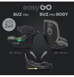 STWÓRZ ZESTAW 2 W 1 – BUZ PRO BODY jest elementem zestawu 2 w 1 z fotelikiem EASYGO BUZ PRO, więc montowany jest na tej samej samochodowej bazie ISOFIX. Jest to rozwiązanie tańsze niż zakup dwóch osobnych fotelików, ponieważ używasz tylko jednej bazy obrotowej.