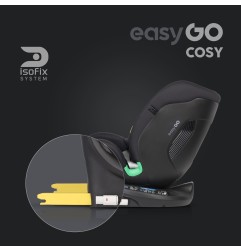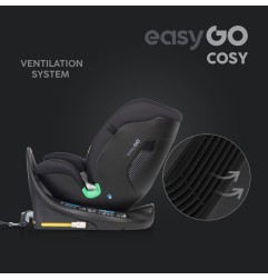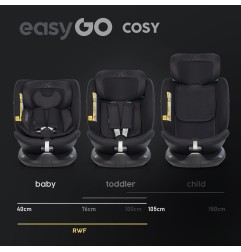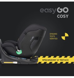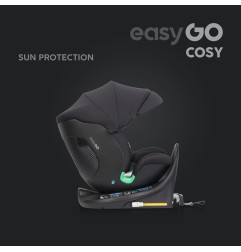 Fotelik samochodowy COSY marki EASYGO jest przeznaczony dla dzieci o wzroście od 40 do 150 cm (czyli od narodzin do około 36 kg). Posiada zintegrowaną bazę obrotową 360° ISOFIX oraz pas TOP TETHER. Dodatkowym zabezpieczeniem jest wysoka rama antyrotacyjna.