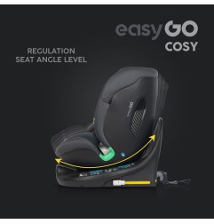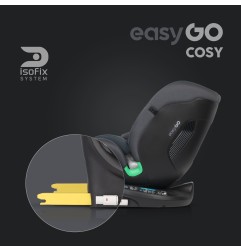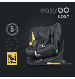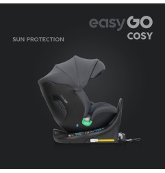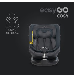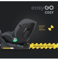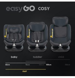 Fotelik samochodowy COSY marki EASYGO jest przeznaczony dla dzieci o wzroście od 40 do 150 cm (czyli od narodzin do około 36 kg). Posiada zintegrowaną bazę obrotową 360° ISOFIX oraz pas TOP TETHER. Dodatkowym zabezpieczeniem jest wysoka rama antyrotacyjna.