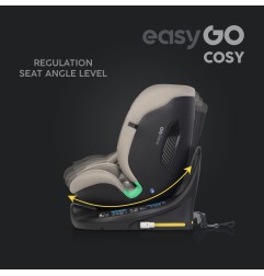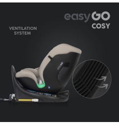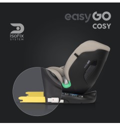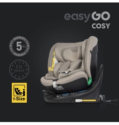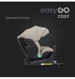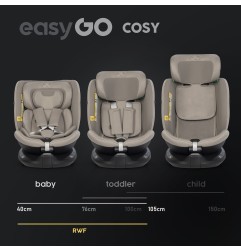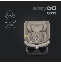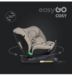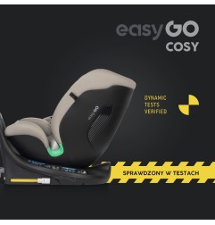 Fotelik samochodowy COSY marki EASYGO jest przeznaczony dla dzieci o wzroście od 40 do 150 cm (czyli od narodzin do około 36 kg). Posiada zintegrowaną bazę obrotową 360° ISOFIX oraz pas TOP TETHER. Dodatkowym zabezpieczeniem jest wysoka rama antyrotacyjna.