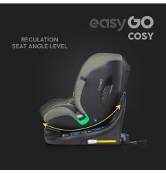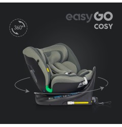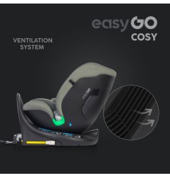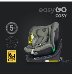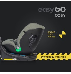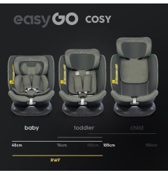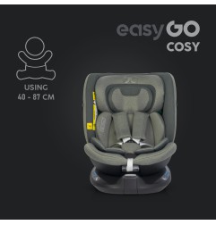 Fotelik samochodowy COSY marki EASYGO jest przeznaczony dla dzieci o wzroście od 40 do 150 cm (czyli od narodzin do około 36 kg). Posiada zintegrowaną bazę obrotową 360° ISOFIX oraz pas TOP TETHER. Dodatkowym zabezpieczeniem jest wysoka rama antyrotacyjna.