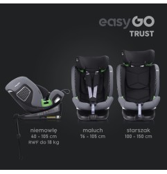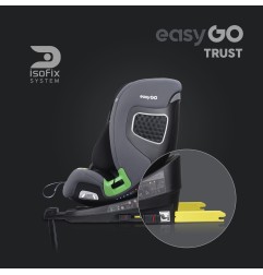 Fotelik samochodowy EASYGO TRUST jest przeznaczony dla dzieci o wzroście od 40 do 150 cm (kierując się starym kryterium wagowym jest to odpowiednik fotelika dla dzieci od narodzin do 36 kg). Tak duży przedział udało się uzyskać dzięki zaawansowanym technologicznie rozwiązaniom takim jak na przykład wysuwany blok nogi podpierającej i możliwość całkowitego ukrycia nogi w bryle bazy. Innym rozwiązaniem, które umożliwia przewożenie w foteliku dzieci od narodzin jest system wkładek redukcyjnych wypełnionych pianką „memory foam”.