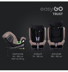 Fotelik samochodowy EASYGO TRUST jest przeznaczony dla dzieci o wzroście od 40 do 150 cm (kierując się starym kryterium wagowym jest to odpowiednik fotelika dla dzieci od narodzin do 36 kg). Tak duży przedział udało się uzyskać dzięki zaawansowanym technologicznie rozwiązaniom takim jak na przykład wysuwany blok nogi podpierającej i możliwość całkowitego ukrycia nogi w bryle bazy. Innym rozwiązaniem, które umożliwia przewożenie w foteliku dzieci od narodzin jest system wkładek redukcyjnych wypełnionych pianką „memory foam”.