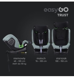 Fotelik samochodowy EASYGO TRUST jest przeznaczony dla dzieci o wzroście od 40 do 150 cm (kierując się starym kryterium wagowym jest to odpowiednik fotelika dla dzieci od narodzin do 36 kg). Tak duży przedział udało się uzyskać dzięki zaawansowanym technologicznie rozwiązaniom takim jak na przykład wysuwany blok nogi podpierającej i możliwość całkowitego ukrycia nogi w bryle bazy. Innym rozwiązaniem, które umożliwia przewożenie w foteliku dzieci od narodzin jest system wkładek redukcyjnych wypełnionych pianką „memory foam”.