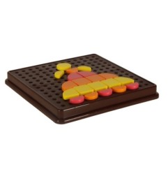 Zestaw zawiera klocki w 5 różnych kolorach i kształtach geometrycznych, które można dowolnie układać, tworząc różnorodne wzory i kompozycje na planszy. Karty z przykładami obrazków pozwalają dziecku rozwinąć umiejętność obserwacji i odwzorowywania kształtów.