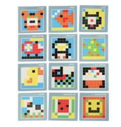Zestaw zawiera 20 dwustronnych kart, które pełnią funkcję inspiracji dla dziecka. Na jednej stronie znajduje się gotowy wzór, a na drugiej układ symboli geometrycznych, które dziecko muszą dopasować do odpowiednich kolorów, co jest dodatkowym wyzwaniem intelektualnym.