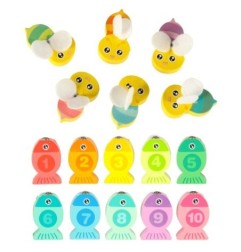 SORTER/UKŁADANKA EDUKACYJNA - dopasuj kształty Na każdej rybce została umieszczona jedna z cyferek. Dopasuj , każdą rybkę do odpowiedniego otworu, w taki sposób, aby cyferki na podstawie i rybkach pokrywały się. Dodatkowo do zestawu dołączono małe pszczółki, które należy włożyć na miejsce za pomocą pęsety