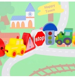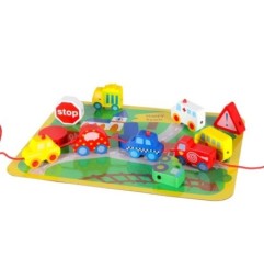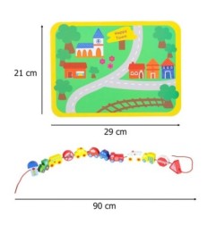 Każdy element został zaprojektowany tak, aby wspierać rozwój małej motoryki oraz ćwiczyć koordynację ręki. Nawlekanie klocków na sznurek doskonali umiejętności motoryki małej, uczy precyzji i cierpliwości. To doskonały trening dla maluchów, dzięki któremu dziecko rozwija się w sposób naturalny i radosny. Zabawka zawiera kolorową planszę z trwałego papieru, która przedstawia barwne miasteczko i inspiruje dziecko do tworzenia własnych historii podczas zabawy. Plansza stanowi doskonałe tło dla drewnianych klocków, pomagając rozwijać wyobraźnię przestrzenną i ułatwiając naukę poprzez zabawę.
