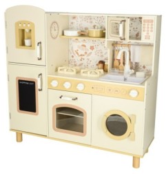 W zestawie wraz z drewnianą kuchenką dla dzieci znajdziesz akcesoria, takie jak: filiżankę, garnek, patelnię, szpatułki kuchenne, solniczkę i pieprzniczkę, a także pralkę, mikrofalówkę, piekarnik, zlew z funkcją lania wody i szafkami do przechowywania. Dzięki temu kreatywna zabawa staje się codziennością, a dziecko uczy się swobodnego poruszania i dbania o porządek w swojej kuchennej przestrzeni.