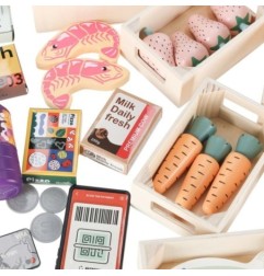 Dziecko może kupić produkty spożywcze, które mają różnorodne kształty i faktury, a następnie podsumować zawartość zakupów przy kasie. Można zapłacić kartą lub gotówką, a także zeskanować aplikację na telefonie. Zabawa w sklep pozwala na rozwijanie umiejętności społecznych, a także daje przestrzeń do nauki liczenia.