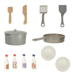 Liczne akcesoria – garnek, patelnia, sztućce, talerze, a nawet cztery sosy