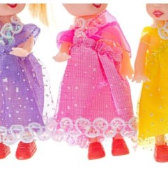 Każda z lalek ma sukienkę w innym kolorze: różowym, żółtym i fioletowym, oraz czerwone buciki.