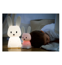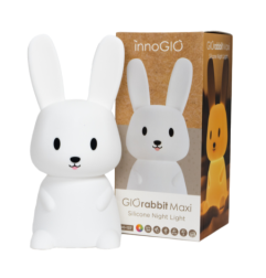Silikonowa lampka nocna GIOrabbit Maxi GIO-137 ROZŚWIETL POKÓJ RADOSNYMI LAMPKAMI Magiczne światło lampki nocnej, które będzie towarzyszyć dziecku w krainie snów! Zmieniające się kolory świateł pomogą bez trudu zasnąć Twojemu dziecku. Ten uroczy Króliczek reaguje na dotknięcie ręki, zmieniając stopniowo kolory. Spokojny sen Twojego dziecka GIOrabbit świeci aż w 8 kolorach. Królik będzie doskonałym kompanem dla Twojego dziecka podczas zasypiania. Lampeczka posiada 3 tryby świecenia. Dzięki pilotowi dostosujesz natężenie światła do swoich potrzeb. Delikatnie rozproszy ciemność i zapewni przyjemne światło do zasypiania. Lampka nie nagrzewa się. Jest bardzo przyjemna w dotyku co sprawia, że staje się również ulubioną przytulanką dziecka. Bezpieczeństwo i zabawa Miękki elastyczny silikon niezawierający BPA z jakiego wykonana została lampeczka zapewnia bezpieczeństwo użytkowania nawet najmniejszych dzieci. Długie uszy świetnie sprawdzą się do trzymania lampki przez małe dzieci. Natomiast zmiana kolorów za pomocą dotknięcia lampki ręką to świetna zabawa nie tylko podczas wieczornego rytuału zasypiania. Dziecko może dowoli zgniatać lampkę, a ona po chwili powróci do swojego kształtu. Lampeczka jest niezwykle łatwa w obsłudze. A dzięki wbudowanemu akumulatorowi wygodnie i szybko można ją naładować przy pomocy kabla USB typu C (w zestawie). Idealna do pokoju noworodka, niemowlaka, niezastąpiona podczas nocnego przewijania i karmienia. Również dla starszych dzieci będzie najlepszym przyjacielem, zapewniając spokojny sen i chroniąc przed strachem związanym z ciemnościami. W dzień będzie piękną dekoracją pokoju dziecka. Dla dzieci w wieku: od urodzenia Ładowana za pomocą kabla USB-C (w zestawie) Przełączanie dotykowe dla zmiany koloru światła Świeci w 8 kolorach, zmienia kolor stopniowo co 3 sekundy Produkt wyposażony w praktycznego pilota do przełączania kolorów lampki, funkcji ON / OFF, ustawienia czasomierza ( 15, 30 lub 60 min) oraz natężenia światła 3 tryby pracy Po pełnym naładowaniu działa ok 12-24 godziny