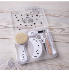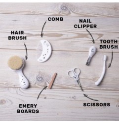 Szczotka do włosów wykonana z naturalnego miękkiego koziego włosia. przeznaczona dla noworodków i niemowlaków. Zapobiega występowaniu ciemieniuchy i elektryzowaniu włosów. Grzebyk idealny do czesania pierwszych włosków. Wygodne do chwytania i precyzyjnej kontroli przy pielęgnacji paznokci. Nożyczki z zaokrąglonymi krawędziami specjalne dostosowane do użytku dla najmłodszych dzieci. Bezpieczny i łatwy w użyciu obcinacz, stanowi niezbędne uzupełnienie pielęgnacji. Cztery dwustronne pilniczki, konieczne do wyrównania brzegów paznokci. Pierwsza szczoteczka do zębów z ergonomicznym uchwytem i miękkim włosiem czyści ząbki, masując dziąsła zapewniając prawidłowy rozwój.