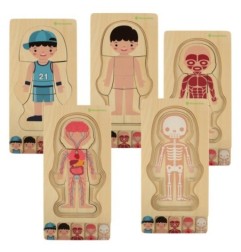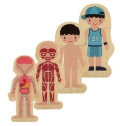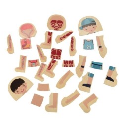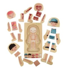Elementy układanki nakładają się warstwowo. Zadaniem malucha jest ułożyć w kolejności szkielet człowieka, organy wewnętrzne, mięśnie, ciałko i na samym końcu ubranko.