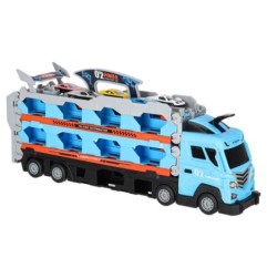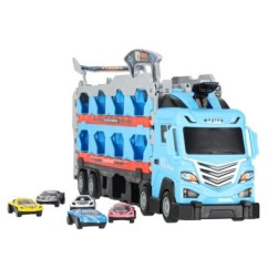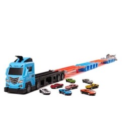 Zabawka łączy w sobie funkcję klasycznej lawety do transportu aut, a także wyścigowego toru. Po rozłożeniu laweta zamienia się w imponujący podwójny tor o długości aż 210 centymetrów, który zapewnia pełną emocji zabawę!