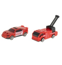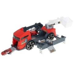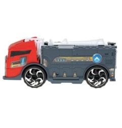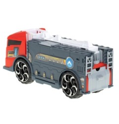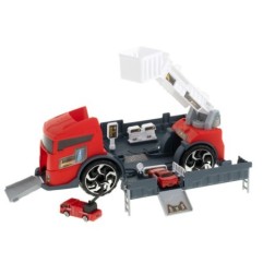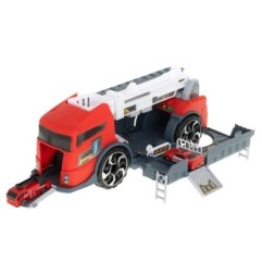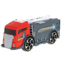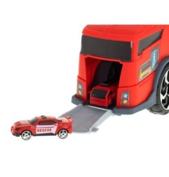Duży transportowiec w postaci wozu strażackiego, który na swoim pokładzie może przetransportować dołączone do zestawu auta.