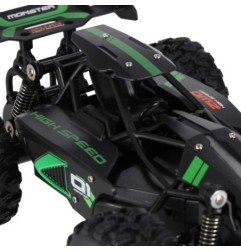Model RC płynnie porusza się po nierównym i kamienistym podłożu. To zasługa dużych kół z bieżnikami oraz sprężynowych amortyzatorów. Dzięki nim auto bez problemu pokonuje przeszkody na drodze.