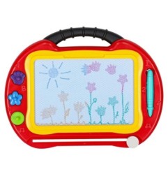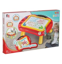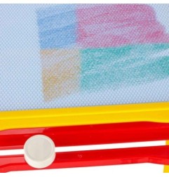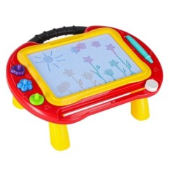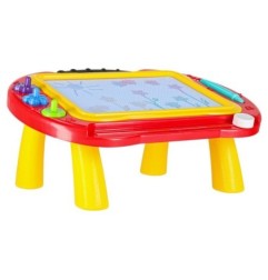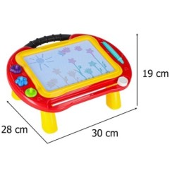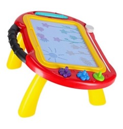 Kolorowy stolik ze znikopisem i stempelkami znakomicie się sprawdzi jako pierwsza tablica kreatywna dla malucha. Tablica do rysowania w 4 kolorach to rozwiązanie będące alternatywą dla zwykłej kartki i kredek – wystarczy przesunąć suwak, by zacząć rysować od nowa. Na tablicy można wykonywać proste rysunki lub uczyć się pisania literek i cyferek.
