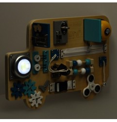 Ta tablica jest w kształcie autobusu, co z pewnością spodoba się każdemu miłośnikowi pojazdów. Elementy sensoryczne również nawiązują do motoryzacji – maluch znajdzie na tablicy drewniane autka, a także ukryte pod kolorowymi kwadratami rysunki stacji benzynowej i myjni samochodowej.