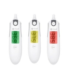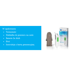 Termometr na podczerwień do ucha i czoła Model: KFT-22Mtermometr na podczerwień do ucha Termometr na podczerwień KFT-22M to poręczny i wielofunkcyjny przyrząd do mierzenia temperatury ciała, obiektu i otoczenia. Termometr umożliwia pomiar temperatury w uchu oraz na czole, po założeniu dodatkowej nakładki. Termometr pozwala na kontrolę temperatury pacjenta, jego otoczenia czy podawanych mu posiłków. Termometr posiada wbudowaną pamięć ostatnich 20 pomiarów. Po 25 sekundach bezczynności termometr zamienia się w zegar - wyświetla godzinę a tym samym ogranicza zużycie energii. Trójkolorowy wyświetlacz ułatwia interpretację wyniku. DUŻY KOLOROWY WYŚWIETLACZ Duży, podświetlany ekran ułatwia odczyt pomiaru nawet osobom słabo widzącym. Kolorowy wyświetlacz ułatwia odczyt i szybką ocenę wyniku pomiaru. Gdy odnotowany przez termometr pomiar jest niższy niż 37,4°C ekran podświetli się na zielono. Żółty kolor podświetlenia oraz alarm (4 krótkie dźwięki) wskazują na stan podgorączkowy i pojawia się, gdy wynik znajduje się w przedziale od 37,5 °C-37,9 °C. Czerwone podświetlenie, oraz alarm dźwiękowy (8 krótkich dźwięków) informują o wysokiej gorączce to wynik powyżej 38°C. WIELOFUNKCYJNY Dzięki specjalnej nakładce możliwy jest pomiar temperatury na dwa sposoby: w uchu i na czole. Tryb pomiaru temperatury obiektu i otoczenia to dodatkowe funkcje termometru, które przydają się w codziennej opiece nad dzieckiem lub osobą chorą. PAMIĘĆ Wbudowana pamięć obejmuje aż 20 ostatnich wyników. Odczyt poprzednich pomiarów ułatwia kontrolowanie temperatury w ciągu dobry u kliku pacjentów. ETUI Miękki woreczek wykonany z tkaniny mieści termometr oraz nakładkę. Ułatwia przechowywane termometru i chroni go przed kurzem. Dane techniczne Wymiary 145 mm X 37 mm X 35 mm Waga ok. 53 g (z bateriami) Zakres pomiaru od 0? do 100? (od 32°F do 212°F) Źródło zasilania 2X baterie 1,5V AAA