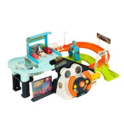 W zestawie znajduje się kierownica, która pozwala dziecku poczuć się jak „za kółkiem” prawdziwego auta. Trzy przyciski aktywują efekty dźwiękowe, umilające zabawę. Dodatkową funkcją kierownicy jest uruchamianie jednej z dwóch wind, które pomagają małym autkom dotrzeć na szczyt toru.