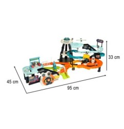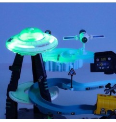 Centralnym punktem toru jest futurystyczna wieża UFO, która po uruchomieniu świeci się i wydaje nietypowe dźwięki dodające klimatu kosmicznej scenerii. Tor samochodowy nie tylko bawi, ale także rozwija zdolności manualne, koordynację i wyobraźnię dziecka, przenosząc je w fascynujący świat pełen przygód!