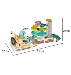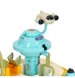Podwójny tor samochodowy zapewnia dwa razy więcej emocji i możliwości zabawy. Z dołączonych elementów można stworzyć dwa mniejsze tory lub połączyć je w jeden duży, po którym małe samochodziki pędzą w kosmicznej scenerii. Większy tor wyposażony jest w elektryczną windę, która automatycznie transportuje auta na szczyt, zapewniając nieprzerwaną zabawę. Mniejszy tor posiada interaktywne elementy, które dziecko musi samodzielnie obsługiwać, by umożliwić przejazd samochodom, co angażuje i rozwija jego zdolności manualne. W zestawie znajduje się sześć pojazdów, w tym radiowóz i betoniarka, co pozwala na różnorodną zabawę.