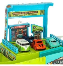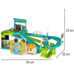 Tor samochodowy jest pełen zakrętów i wzniesień, po których będą jeździć cztery samochodzik. Aby autka mogły wjechać z łatwością na szczyt toru, należy uruchomić windę, którą można obsługiwać ręcznie, kręcąc pokrętłem, lub automatycznie, podłączając kierownicę i pociągając wajchą. Kierownica jest wyposażona w trzy przyciski aktywujące efekty dźwiękowe, co jeszcze bardziej uatrakcyjnia zabawę.