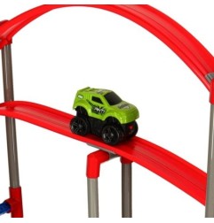 Zielony samochód z zestawu to pojazd specjalnie zaprojektowany do pokonywania torów o ekstremalnych trasach! Dzięki zasilaniu dwoma bateriami AA samodzielnie jeździ po torze, pokonując każdy odcinek bez najmniejszego problemu.