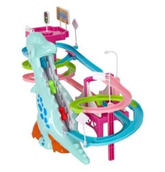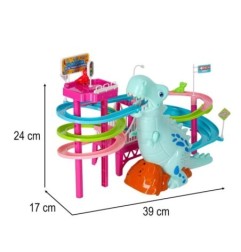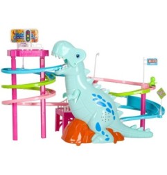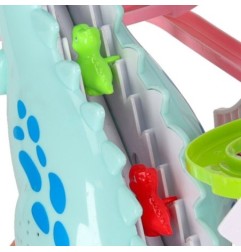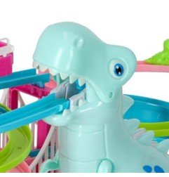 Tor wyścigowy z dinozaurem, który połyka samochodziki w kształcie małych dinozaurów to świetna zabawa dla dzieci.