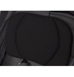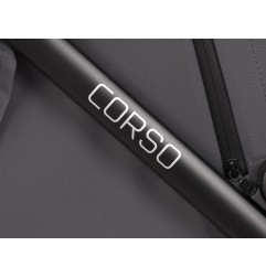 Siedzisko wózka CORSO jest duże i szerokie. Budka przeciwsłoneczna zawieszona jest wysoko nad oparciem, tak aby wózek bez problemu pomieścił nawet duże dziecko. Duża dodatkowa sekcja budki pojawia się po rozsunięciu suwaka. W tylnej części budki znajduje się duży zamykany suwakiem panel wentylacyjny i praktyczna kieszonka. Oparcie posiada płynną regulację od pozycji w pełni leżącej do pozycji w pełni siedzącej. Dla mniejszych dzieci plusem będzie miękka wygodna poduszka dopinana do górnej części oparcia. Oczywiście można ją zdemontować w dowolnym momencie. Specjalne 5-punktowe pasy bezpieczeństwa posiadają regulację wysokości. Podnóżek posiada funkcję "wypchnięcia" na zewnątrz, co umożliwia starszemu wygodne dziecku wysunięcie nóżek poza stopień zakańczający podnóżek.