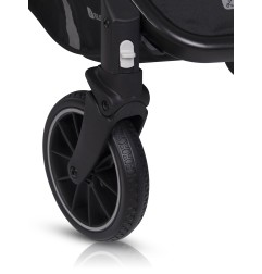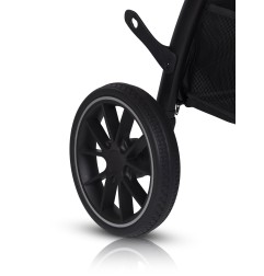 Duże łożyskowane koła z gumowymi oponami i całorocznym bieżnikiem sprawdzą się na każdej nawierzchni (również na śniegu). Amortyzacja wszystkich kół zaprojektowana została w taki sposób, żeby optymalnie amortyzowała siedzisko. Jeśli chcesz ją przetestować naciskaj na siedzisko, a nie na prowadnicę wózka. Wiele wózków oferowanych na rynku posiada amortyzację dobrze wyczuwalną na prowadnicy wózka, ale w rzeczywistości słabo amortyzującą siedzisko.