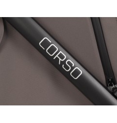 Tapicerka wózka CORSO wykonana została z przyjemnej w dotyku grubej dzianiny w modnych kolorach. Na siedzisku zastosowana została dzianina w kolorze „melanż”, który doskonale maskuje zabrudzenia.W celu zwiększenia bezpieczeństwa projektanci zastosowali elementy odblaskowe po każdej stronie wózka (odblaskowe logotypy i taśmy wykończeniowe). Tkanina budki przeciwsłonecznej zabezpieczona została impregnatem UV.