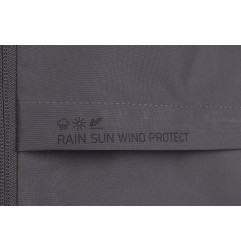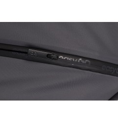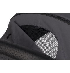 Budka przeciwsłoneczna posiada dodatkową rozpinaną sekcję, która pozwala pochylić ją do przodu i osłonić dziecko przed nisko operującym słońcem. Dodatkowo budka zakończona jest daszkiem przeciwsłonecznym, który w razie potrzeby można złożyć i schować we wnętrzu budki. W tylnej części budki znajdziemy okienko do podglądania dziecka i olbrzymi zamykany panel wentylacyjny wykończony siateczką. Projektanci nie zapomnieli również o praktycznej kieszonce.