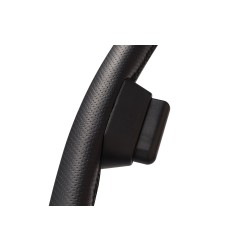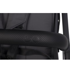 Rączka wózka i barierka zabezpieczająca dziecko zostały obszyte stylową skórą ekologiczną, która zapewnia większy komfort i pewniejszy chwyt. Skóra posiada modny wzór perforacji oraz wytłoczony logotyp, co nadaje wózkowi sportowego charakteru.