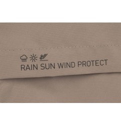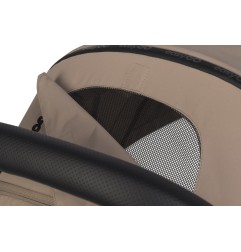 Budka przeciwsłoneczna posiada dodatkową rozpinaną sekcję, która pozwala pochylić ją do przodu i osłonić dziecko przed nisko operującym słońcem. Dodatkowo budka zakończona jest daszkiem przeciwsłonecznym, który w razie potrzeby można złożyć i schować we wnętrzu budki. W tylnej części budki znajdziemy okienko do podglądania dziecka i olbrzymi zamykany panel wentylacyjny wykończony siateczką. Projektanci nie zapomnieli również o praktycznej kieszonce.