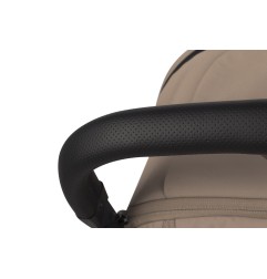 Rączka wózka i barierka zabezpieczająca dziecko zostały obszyte stylową skórą ekologiczną, która zapewnia większy komfort i pewniejszy chwyt. Skóra posiada modny wzór perforacji oraz wytłoczony logotyp, co nadaje wózkowi sportowego charakteru.