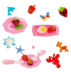 Garnuszek: 12 cm x 5,5 cm (wysokość z pokrywką: 8 cm) Podstawa: 16 cm x 7,5 cm Foremka: 8 cm (kształty: 5,5 - 7 cm) Butelka z żelem: 12 cm x 4 cm x 2,5 cm Sztućce: 10,5 cm x 2,5 cm x 1,5 cm Talerzyk: 10 cm, Tacka: 5,5 cm x 9,5 cm Pojemnik z proszkiem: 7 cm x 5,5 cm Pojemność kleju: 60 ml Opakowanie: 50,5 cm x 38 cm x 9 cm Zestaw zapakowany w kolorowy karton producenta z okienkiem - w sam raz na prezent dla dziecka na urodziny lub świętaBrak ocen