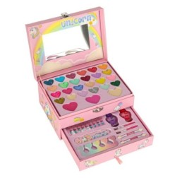 Elegancki kuferek z jednorożcem kryje w sobie różnorodne kosmetyki do makijażu dla dzieci, które są łatwe do zmycia i w pełni dostosowane do delikatnej skóry najmłodszych. Dzięki nim każdy zestaw do makijażu dla dzieci to bezpieczne i radosne odkrywanie kolorów.